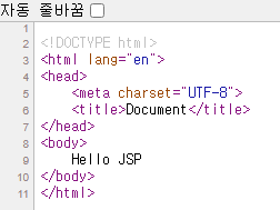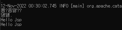 System.out.println("Hello Jsp"); 를 <% %>태그 사이에넣어 출력시키면