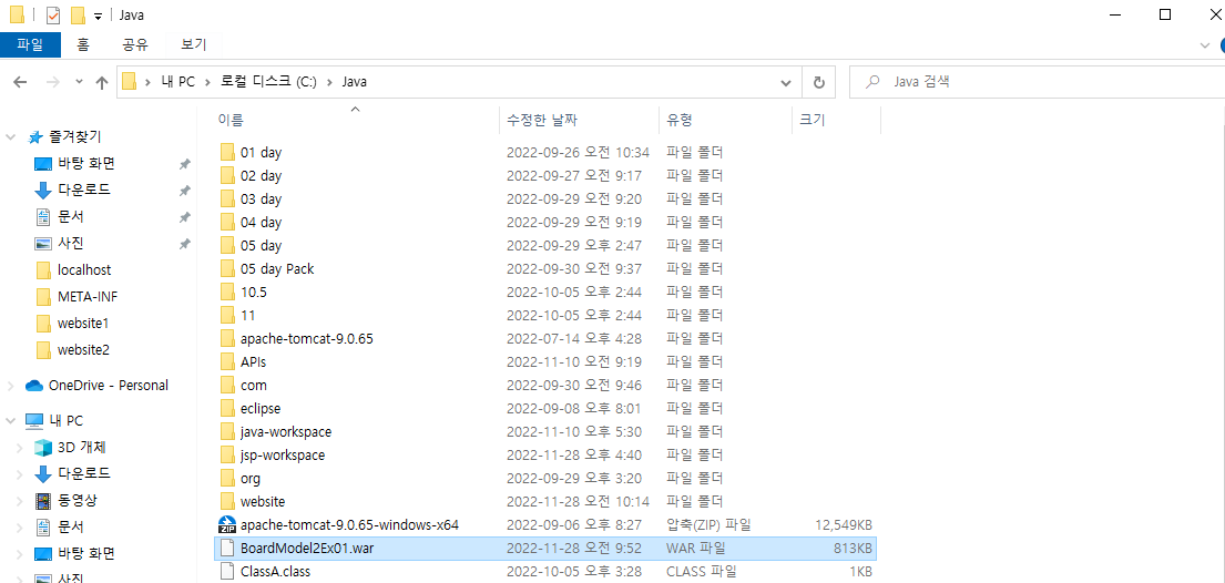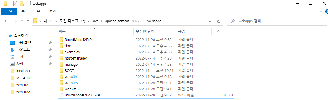 1. C:\Java\apache-tomcat-9.0.65\webapps 에 website1(예명)폴더를 만든다