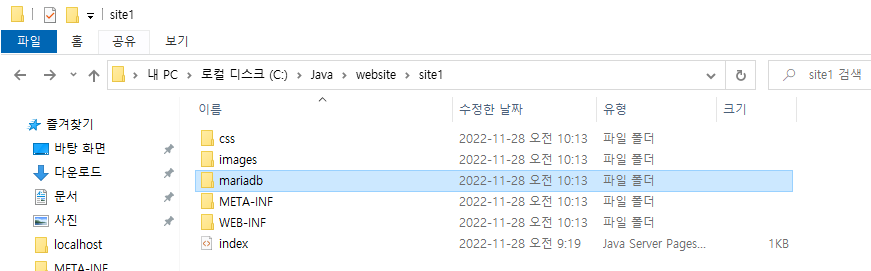 3. 개발용 폴더에서 mariadb폴더(jsp파일)를 복사후 website1폴더에 붙여넣는다