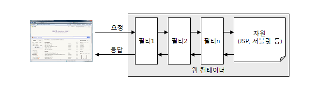 필터는 요청과 응답 사이에 위치하여 최종 자원의 결과를 알맞게 변경할 수 있다.