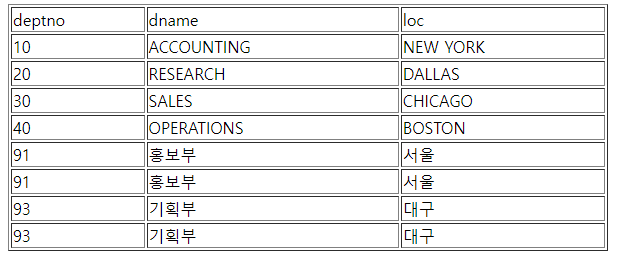 <s:query var="rs" dataSource="${ ds }" sql="select deptno as 부서번호, dname as 부서이름, loc as 부서위치 from dept3" />